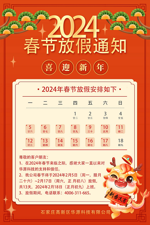 石家莊高新區(qū)華源科技春節(jié)放假通知,公司是石家莊專業(yè)的太陽能、空氣能熱泵服務(wù)商,擁有豐富的行業(yè)經(jīng)驗、專業(yè)的技術(shù)服務(wù),熱水洗浴、制冷、采暖系統(tǒng)咨詢定制電話:4006-311-665,華源科技祝大家新年快樂,龍年吉祥!