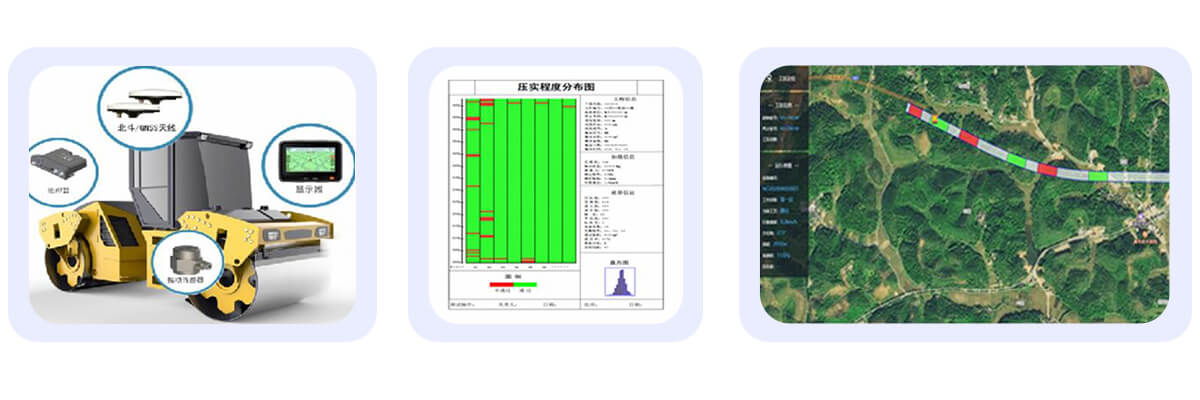 智能碾壓系統是利用北斗+GPS高精度差分定位技術、物聯網技術、實時通訊技術、大數據處理技術等,對壓路機的碾壓遍數、碾壓軌跡、碾壓速度、振頻振幅等數據實時采集,根據采集的數據結合試驗檢測對施工質量(壓實度)進行分析判斷,及時掌握碾壓過程施工質量狀態的技術。